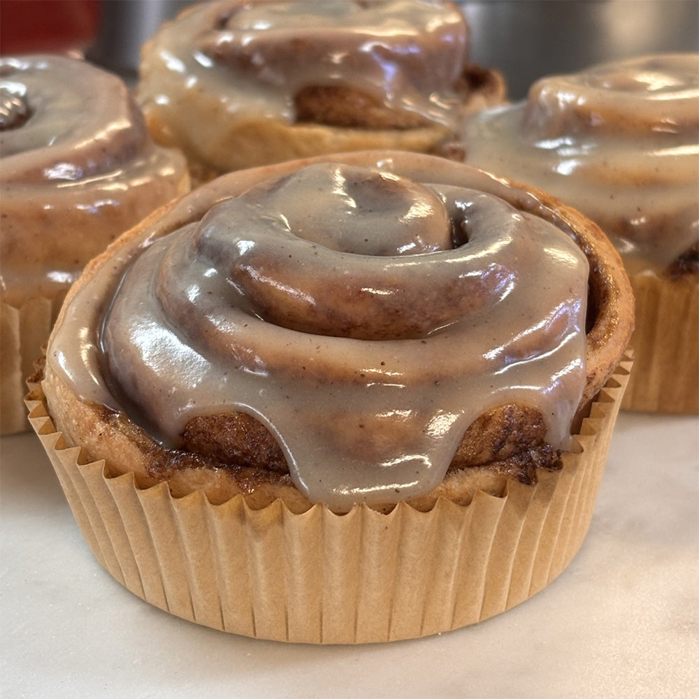 Our signature bun - soft, pillowy dough layered with rich brown sugar and warm cinnamon, baked until perfectly golden, then iced with our signature creamy vanilla bean glaze. There’s nothing simple about how indulgent these are.
